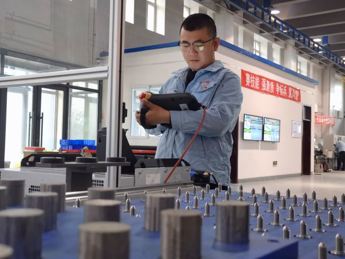 走进49所机械加工车间,虽然机械轰鸣声不绝于耳,但很少能见到工人的身影。在这里,2台机械手臂有条不紊地在每个加工中心之间来回穿梭,传送物料。机械加工车间里,路明望和一名工友站在一旁,仿佛成了机器人的“监工”。